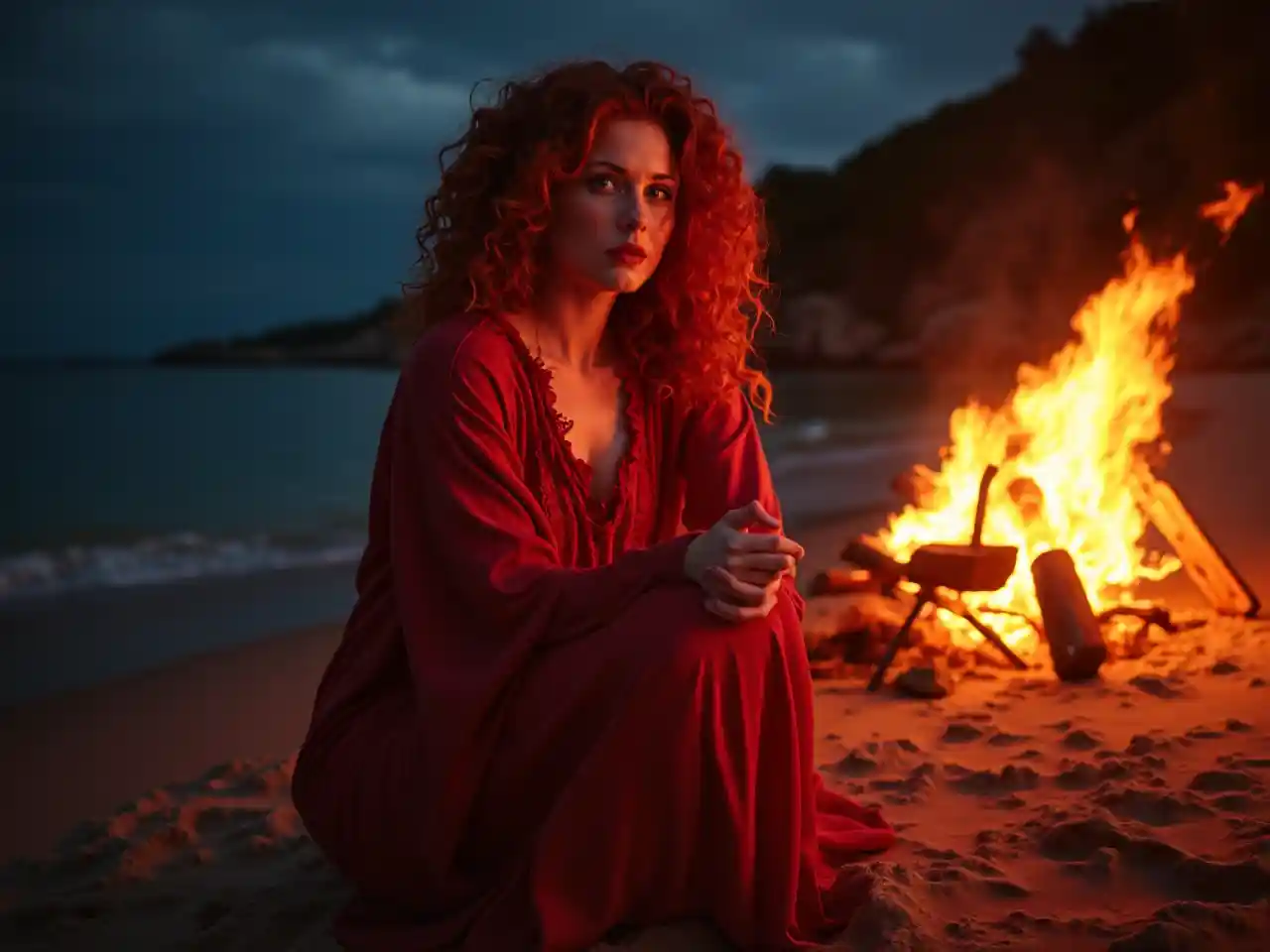 ZoeNữ thần Mom Wiccan mặc thời trang boho màu đỏ, trông giống như nữ diễn viên Brigid Brannagh với mái tóc xoăn màu đỏ. Khi trời tối, cô được thắp sáng bởi một đống lửa lớn trên bãi biển vào ban đêm.