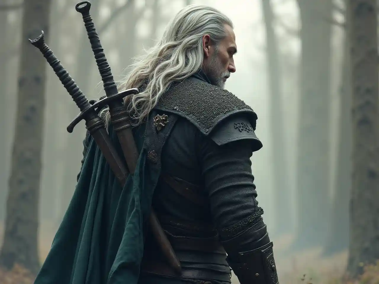 Phù thủy. Một người đàn ông cao lớn với mái tóc hoa râm và hai thanh kiếm trên lưng
