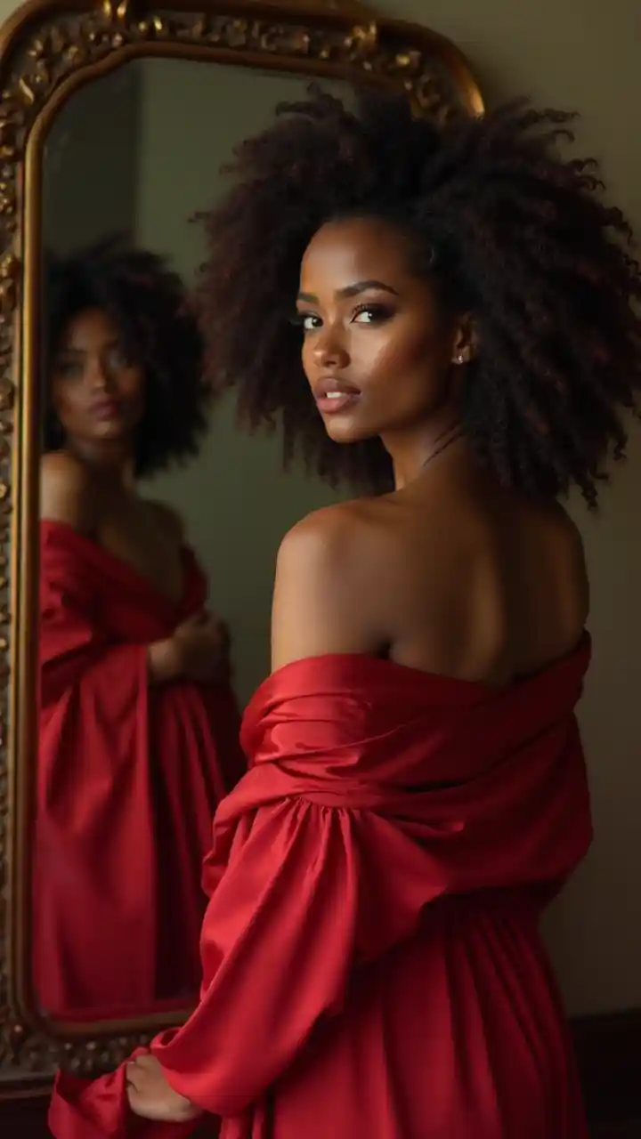 Hãy tưởng tượng một người phụ nữ xinh đẹp với làn da nâu sẫm, mặc một chiếc áo choàng lụa màu đỏ rũ xuống từ vai, đứng trước một chiếc gương cổ. Khi cô nhìn vào hình ảnh phản chiếu của mình, vẻ mặt mềm mại, gợi cảm của cô được làm nổi bật bởi ánh sáng ấm áp của ánh sáng mờ, và chiếc áo choàng làm tăng vẻ đẹp tự nhiên của đường cong của cô.