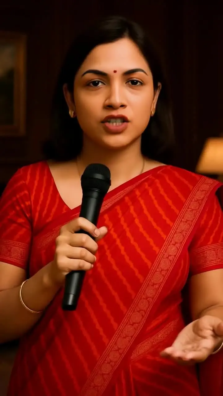Dynamic Storyteller in Vibrant Red Saree Captivates Audience with AI