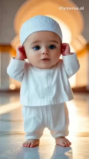 In this charming clip, a baby dressed in a pristine white traditional outfit stands confidently on a light-colored floor, barefoot and beaming with delight. With tiny hands raised near the ears, this little one is ready to steal the show! Thanks to AI magic, our adorable star can lip-sync to catchy tunes and funny phrases that will make you smile. Picture the pure joy as this little cutie mimics popular songs or cracks charming jokes, showcasing an unexpected talent that’s simply irresistible. Whether it's for a family gathering, a fun social media post, or just to brighten someone's day, this delightful display of AI-powered lip-syncing is perfect for any occasion. Get ready to giggle and coo along with this pint-sized performer, bringing laughter and joy to everyone watching!