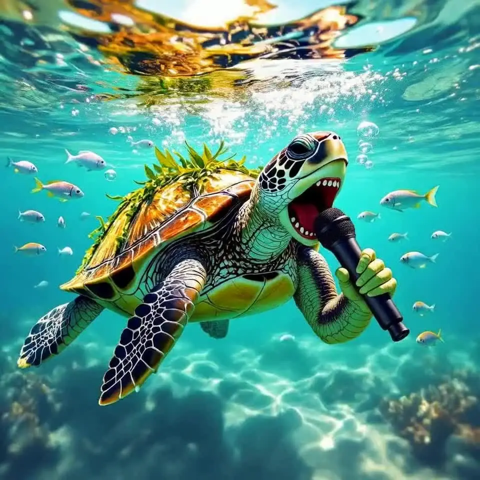Dive into an underwater adventure where a charming turtle, draped in vibrant seaweed, takes center stage! With a microphone in its flippers, this musical marvel belts out enchanting tunes while playful fish dance around, captivated by the show. Thanks to the magic of AI, our turtle friend isn’t just swimming; it’s harmonizing with the ocean’s rhythm! The sunlight filters through the water, creating a mesmerizing backdrop that adds to the charm. This AI technology brings a playful twist, giving these adorable creatures the ability to lip-sync and sing, transforming everyday moments into laughs and joy. Whether it's for a fun social media post, a captivating ad, or just a delightful keepsake, the possibilities are endless! Get ready to giggle as our turtle's catchy songs and moves make waves in the digital world. Who knew singing underwater could be this much fun? Let the good times roll!