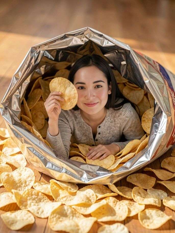 选择Share crisp滤镜,将俏皮的零食包场景、温暖的光线、皱褶的箔纸纹理应用到你的肖像上。