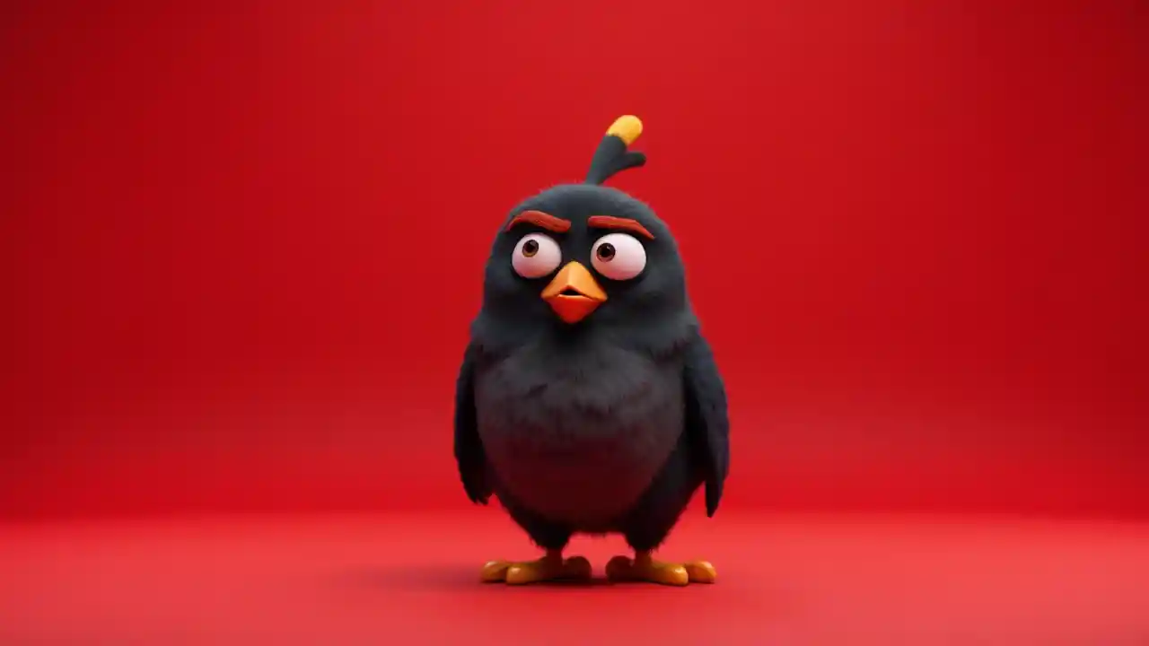愤怒的小鸟,红色背景的黑色圆鸟,以3D风格居中站立,使用美丽的迪士尼动画渲染,皮克斯风格,迪士尼风格,3D风格