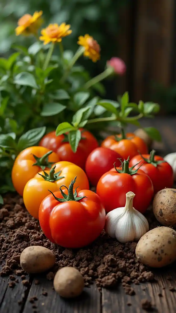 将新鲜的西红柿、辣椒、土豆和大蒜用根/土新鲜采摘,摆放在一张绿色和花朵的质朴木桌上(背景中,一张库存照片,语无伦次,Arcimboldo,让人想起美食杂志封面,专业的美食摄影,静物,新鲜农产品,健康饮食的多彩布置,艺术参考构图精湛的技术arcimboldo启发,自然光照与柔和的阴影和斑驳的光