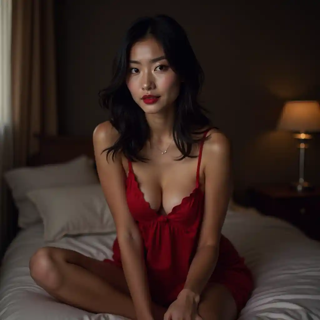 高质量形象,一位迷人的28岁亚裔女性,黑发中长到肩膀以下,红色唇膏,中等胸围,穿着红色睡衣,坐在灯光昏暗的卧室的床上,看着镜头,戏剧性的灯光,模糊的背景