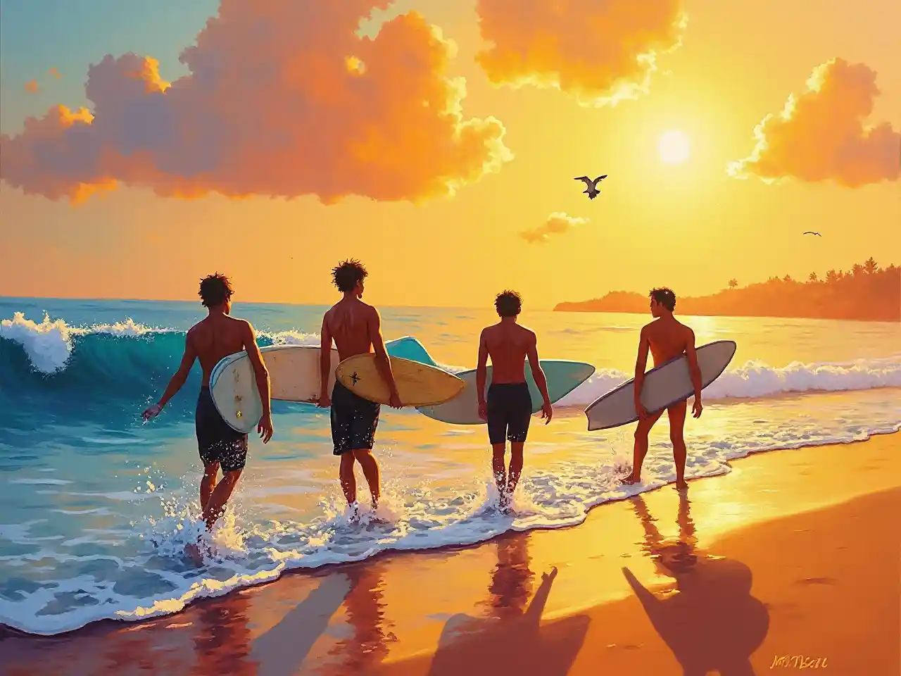 一幅充满活力的高品质油画,在黄金时刻捕捉到阳光亲吻的海滩场景,夕阳的温暖色调与海洋的清凉蓝色完美融合。在琥珀色的天空映衬下,一群群冲浪者沿着波光粼粼的海岸漫步,他们生动的表情反映出兴奋和友情的混合。海浪轻轻拍打,泡沫般的白色边缘在抵达沙滩时闪闪发光,而远处的海鸥则优雅地在上面滑行。冲浪板上俏皮的色彩暗示与脚下柔和的沙色色调形成鲜明对比。温暖的灯光投下长长的阴影,增强了与大自然和谐共度完美一天的感觉。整体氛围活泼无忧无虑,酷似印象派风格,笔触传递运动与能量。