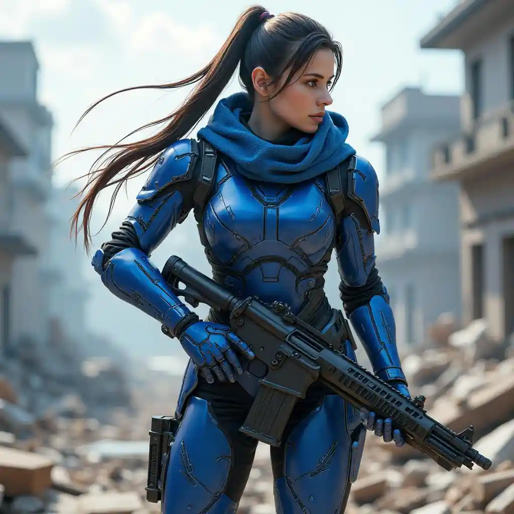 "一个残忍的女忍者机甲,全身披着蓝白相间的未来主义盔甲,腰间绑着一把沉重的AWP步枪。她圆滑的深棕色长发扎成时尚的马尾辫,在风中戏剧性地流淌,与背景中饱受战争蹂躏的城市形成了鲜明的对比。一条蓝色围巾也在微风中戏剧性地挥动,为现场增添了一抹动感。忍者面无表情,散发着致命精准和微妙恐惧的气场,却带着一丝优雅。场景以令人叹为观止的16K分辨率拍摄,数字反射相机效果和光线追踪提升了这一电影镜头的整体质量。明暗对比灯光增强了氛围,为动作丰富、以概念艺术为灵感的构图带来了深度和戏剧性。机甲的设计结合了圆滑的机械元素和动作绘画的艺术触感,给人一种优雅和力量感。整个布景都是3D设计的杰作,以满目疮痍的城市景观为背景,以电影风格的灯光照亮,强调了蓝白盔甲与饱受战争蹂躏的环境之间的对比。整体情绪混合了对危险的感觉和对死亡的微妙恐惧,平衡在0.5,更多地关注刺客的死亡光环而不是压倒性的恐惧。蓝色的游戏装备为她的外表增添了一份未来感,巩固了她在这个后世界末日世界中的致命形象。"