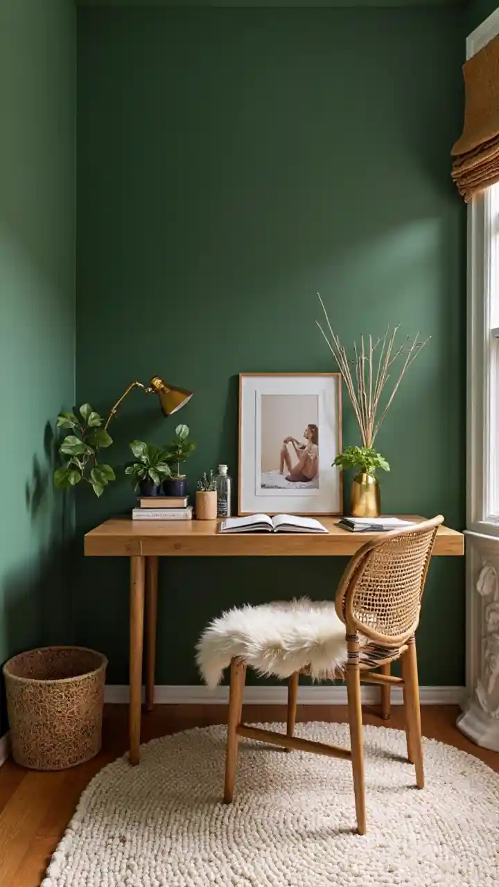 现代化的波西米亚风家居办公和梳妆区,配有绿色墙壁、木质和藤制家具、金色口音和一把毛绒椅子。