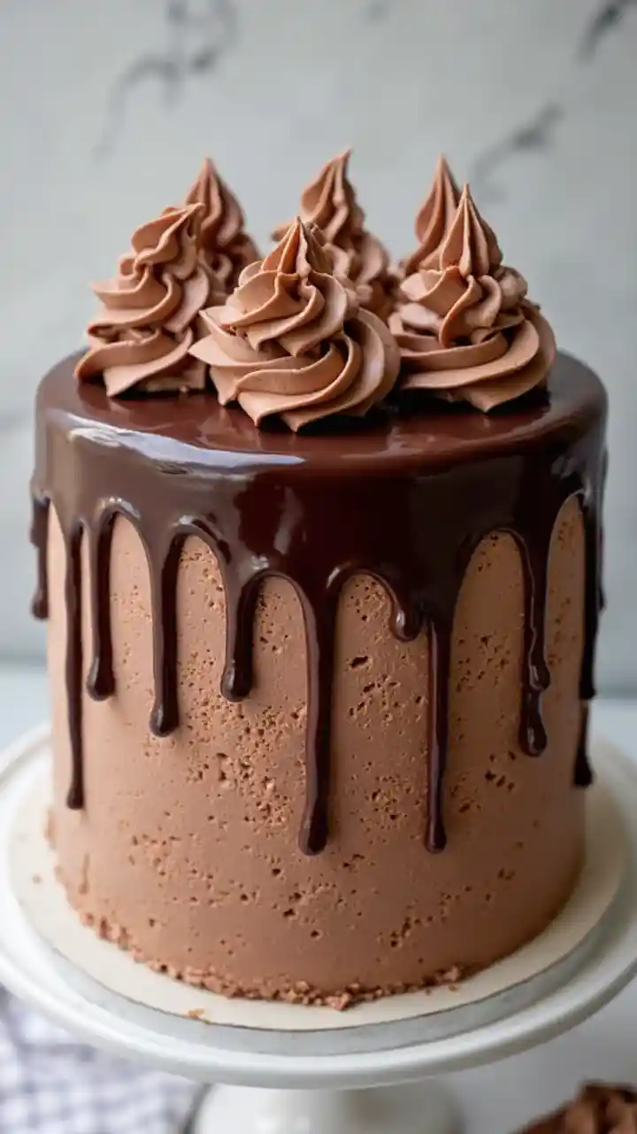一款浓郁的巧克力慕斯生日蛋糕,配以巧克力甘纳许滴和装饰。