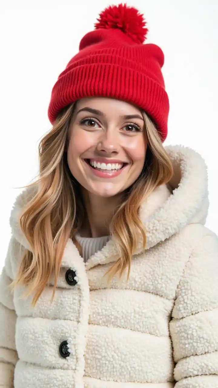 一位满头彩发、头戴红帽的幸福女青年穿着一件白色蓬松外套,与世隔绝