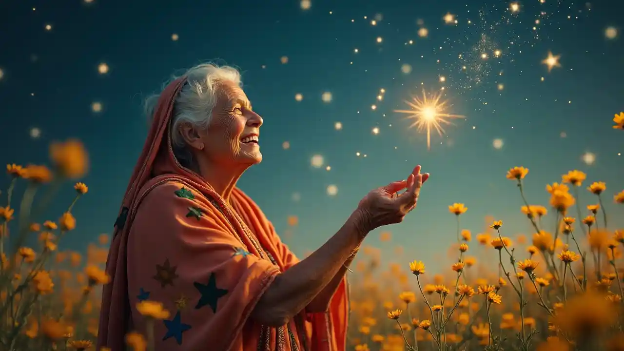 在发光的草地上捕星,一位75岁的南亚妇女穿着一条带有星星补丁的披肩,穿着一件纱丽。野花和星空框住了她,她温柔的勺子在梦幻、奇幻的环境中散发出奇妙和异想天开的喜悦。她的眼睛反射着宇宙。