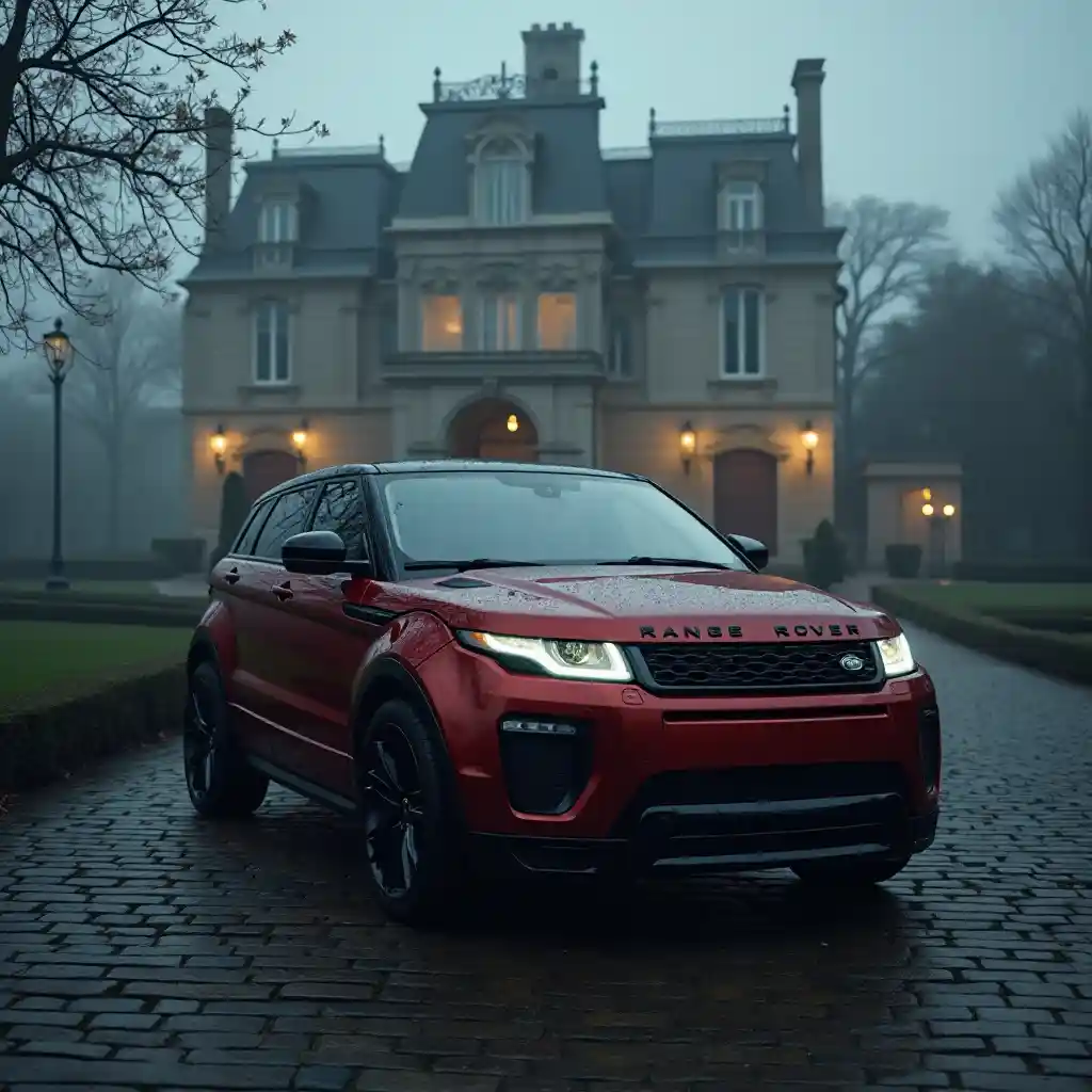一辆令人惊叹的蒸汽朋克风格的最新车型深红色揽胜极光傲然矗立,其抛光的外观在昏暗的灯光下闪烁着高光。它的前大灯发出绚丽的光芒,划破笼罩现场的匍匐雾气,增强了阴森的氛围。车辆停在一座宏伟、复古的豪华宫殿前,其雄伟的外立面低声讲述着一个过去时代的故事。飘渺的薄雾卷须轻抚着鹅卵石车道,营造出一种妖娆神秘的氛围。尖端汽车之美与历史性的富丽堂皇并存,在夜晚令人不安的魅力中唤起一种hygge感,让人想起一件栩栩如生的Artgerm创作。