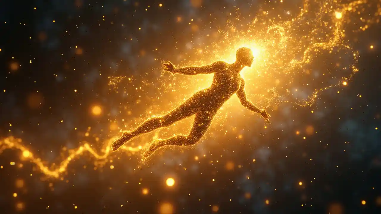 由漂浮在星空中的纯金流动和脉动能量构成的超越cyberkinteic。强烈的色彩。数字艺术,超详细,代表作,高质量,景深,超高清