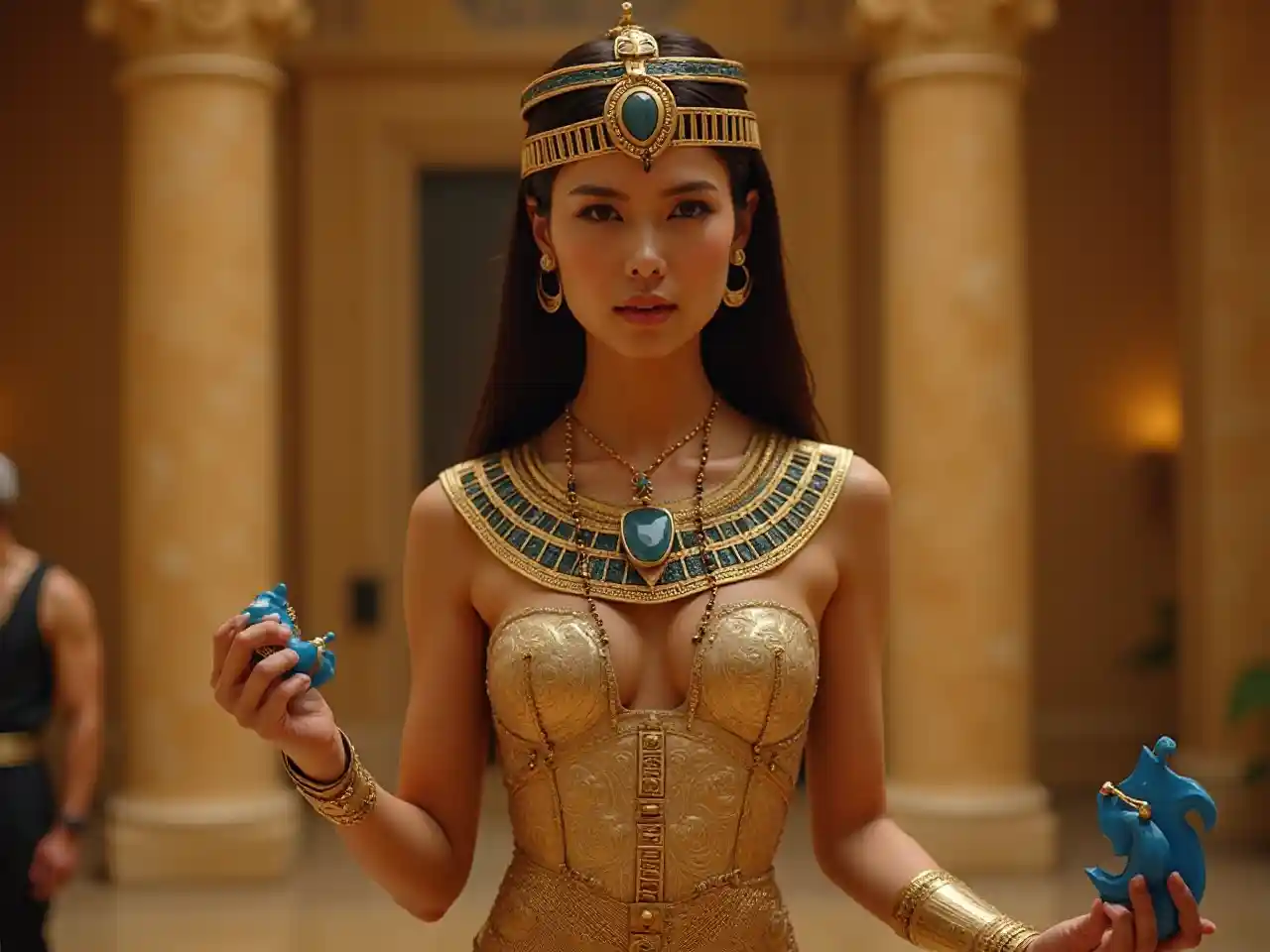 该图像描绘了一个穿着精致的金色服装的人,酷似古埃及皇室。这位个人戴着带有横条纹的头饰和一件中央装饰件,还有一条项链,上面有一块大而突出的宝石。这套服装包括一件贴身的紧身胸衣,上面装饰着错综复杂的图案和一个华丽的大领子。此人右手拿着一件蓝色的小物件,看起来像是一件首饰或一个小配件。背景是一个宏伟、华丽的内部,有高大的柱子和拱形的门道,暗示着一个让人想起古埃及建筑的环境。灯光温暖,突出了装束和周围的奢华细节。