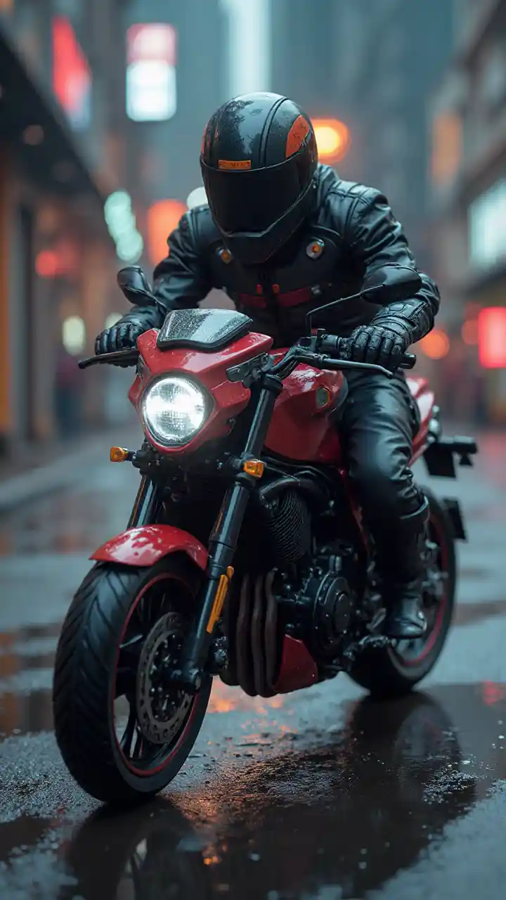 tampak depan sepeda motor listrik concept,ada orang nya,3D,4K,bokeh,cyber punk
