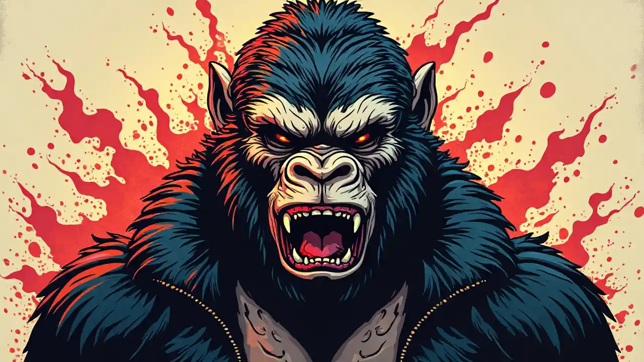 创建一个动态图解,其中包含一个令人生畏的黑帮老大、大猩猩、科迈努、丕秀和龙头的混合体。采用七十年代漫画风格的矢量艺术与完美对称的正面视图,融合了徽标和超级英雄美学的元素,带来迷人的视觉体验。