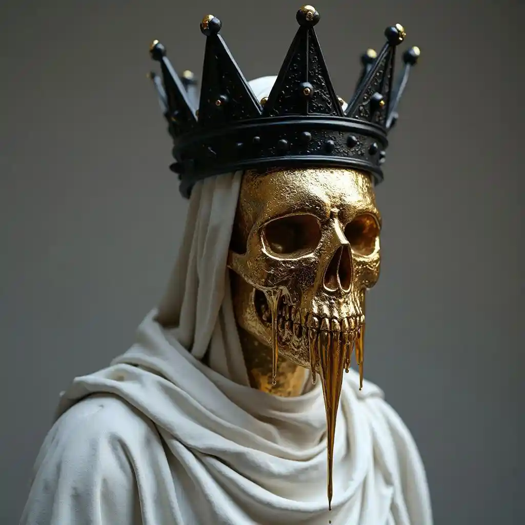 A marble statue wearing a black crown, with a golden skull mask dripping molten gold | highly detailed, photorealistic | minimalistic background, soft lighting
