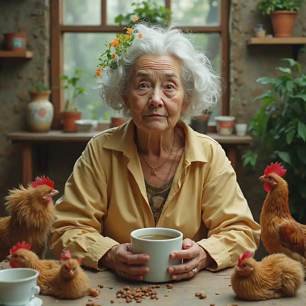 a grandma wearing oversized clothes and plants in her hair surrounded by lots of cats coffee and chickens