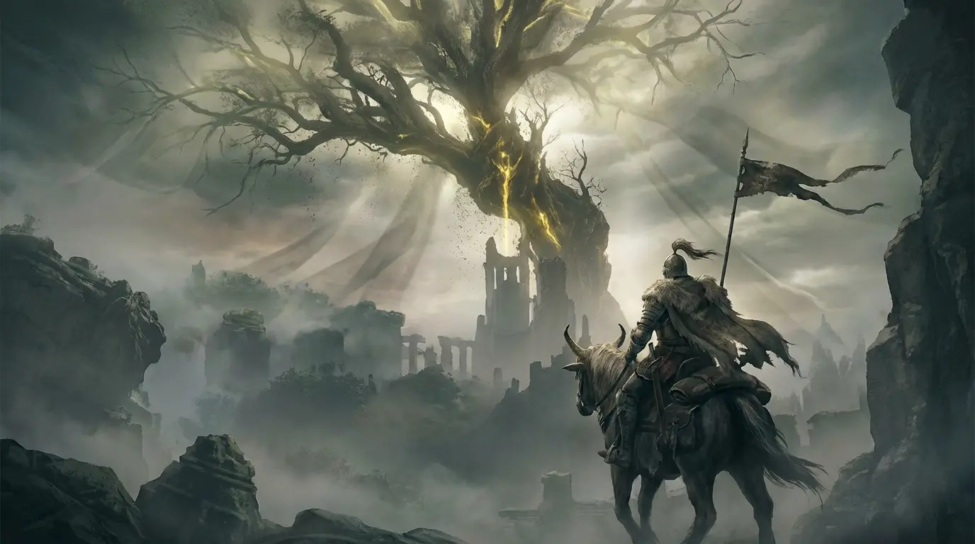 一位孤独的骑士接近一棵巨大的树,发出幽灵般的金色光芒,史诗般的大气雾气。