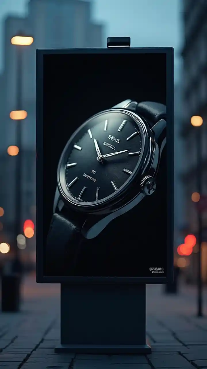 奢侈手表品牌的城市广告牌模型。具有反光面的金属表盘的戏剧性特写。暗背景与微妙的城市灯光散景。大胆的最小排版。逼真的3D可视化展示黄昏时城市环境中的广告牌。专业广告摄影风格。