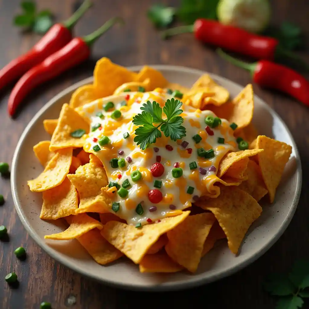 芝士玉米片的时尚样机,厨房风格,精美的装饰与错综复杂的细节。使用在背景逼真的食物渲染新鲜食材辣椒,小葱,大蒜,姜,高良姜。