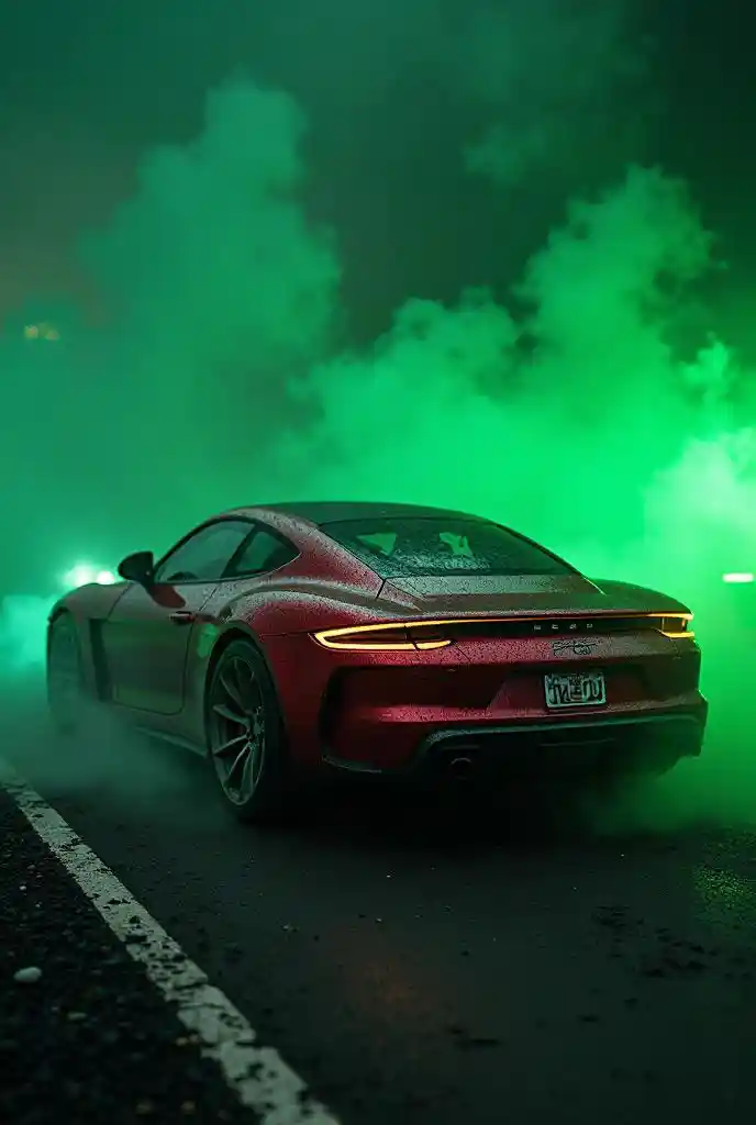 高品质,4K,真实,点赞照片,专业车身配衣服,极致细节,超跑,灾难丨点赞,深红色车身,绿色火焰,不祥,黑暗氛围,DAR