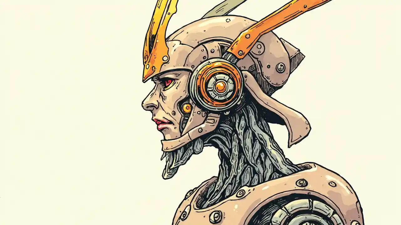 详细笔墨图解一位武士机器人半机械人,仅限头部,详细人类学,极简背景,由herge,以锡锡漫画的风格,色彩斑斓,细节细腻,高品质