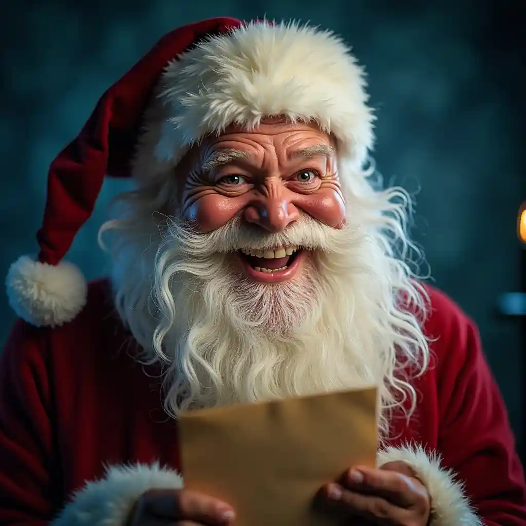 圣诞老人微笑的肖像,缺了一颗牙齿,拿着一封信,异想天开的面部表情,飘逸的白胡子,欢快的漫画,饱和的色彩,红装,锐利的焦点,人像摄影,景深,戏剧性的烛光照明,令人难以置信的高细节,蓝色背景,模糊的背景,