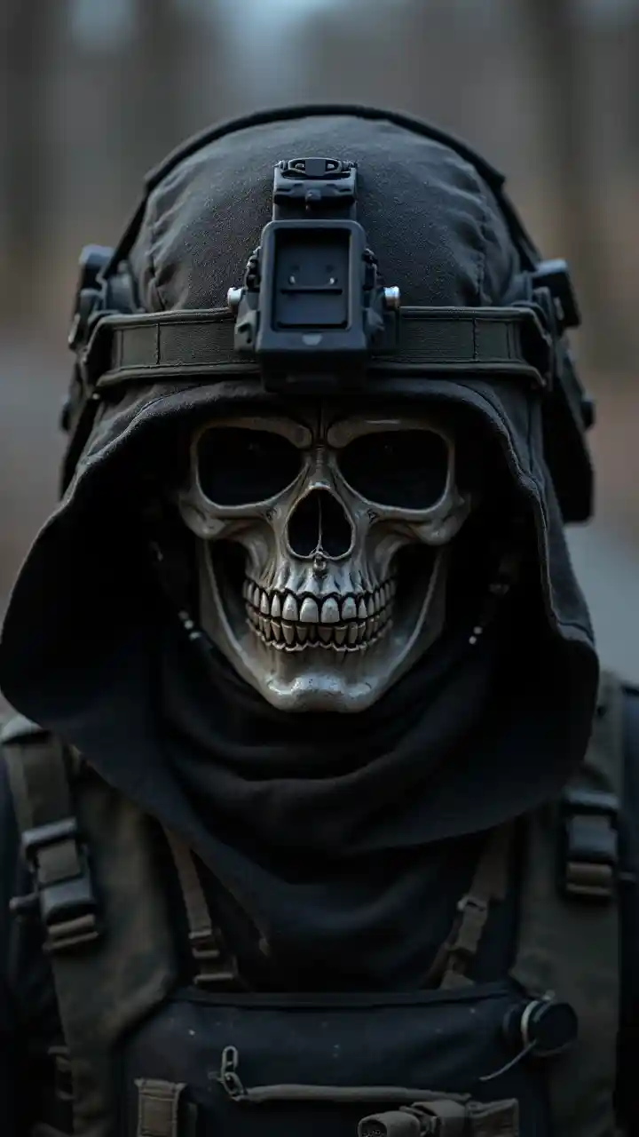 一名戴着骷髅面罩、头戴军用战术头盔的军事人员,头戴兜帽,身穿黑色