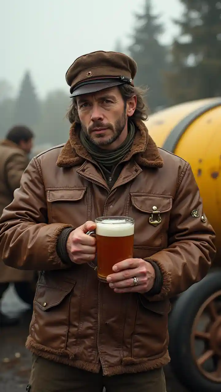 一名身着飞行轰炸机皮夹克的苏联男飞行员手里拿着一大杯格瓦斯,背景中可以看到一个装有格瓦斯的轮子上的苏联黄色桶