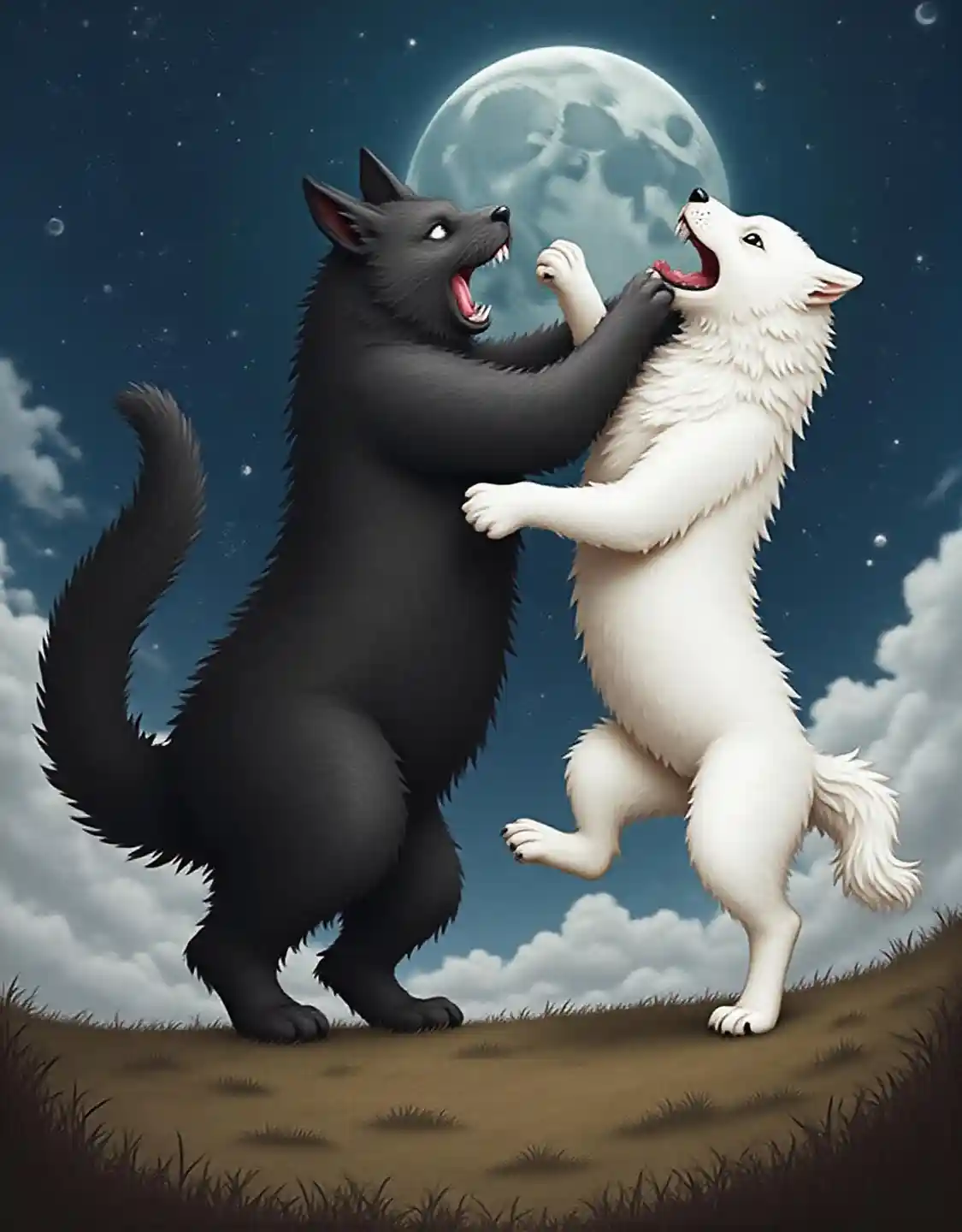 一只大而愤怒的黑猫充满了空间,攻击一只白色的月亮狗,在天空中令人印象深刻的景观之上。一件巨大的、细节丰富的外套,上面有星罗棋布的斑块