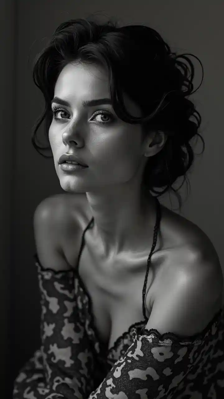 超逼真的照片,以惊艳的细节捕捉优雅的女人,使用索尼A7III拍摄的黑白照片。构图采用垂直的1:2宽高比,充满艺术边缘,引入可控混沌感。现场一丝不苟的个性化,突出了错综复杂的纹理和戏剧性的对比。风格化被深思熟虑地强调,为形象增添了一层深度和性格,创造了一种永恒而迷人的视觉叙事。